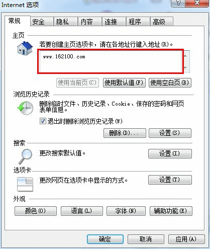 2)然后在打开的对话窗口中的主页栏的地址输入框中输入“http://www.408.cn/”,然后点击窗口上方的“应用”按扭即可,如下图所示: