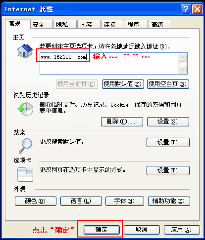 2)然后在打开的对话窗口中的主页栏的主页地址输入框中输入“http://www.408.cn/”,然后点击“确定”按扭即可,如图所示: