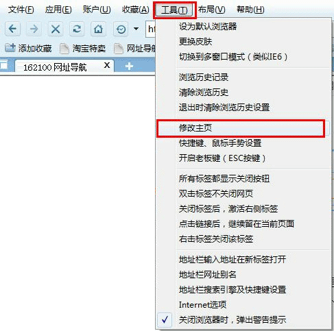 绿色浏览器设置主页的方法: 1)首先,点击浏览器右上角的“菜单”,在下拉列表中选择“工具”—“Internet选择”,如下图所示: