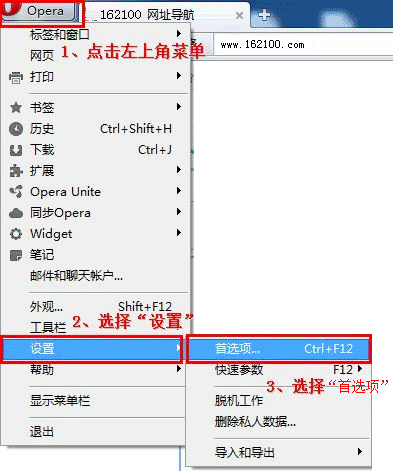 Opera浏览器设置主页的方法: 1)首先,点击左上角菜单按钮,在下拉列表中选择“设置”—“首选项”,如下图所示: